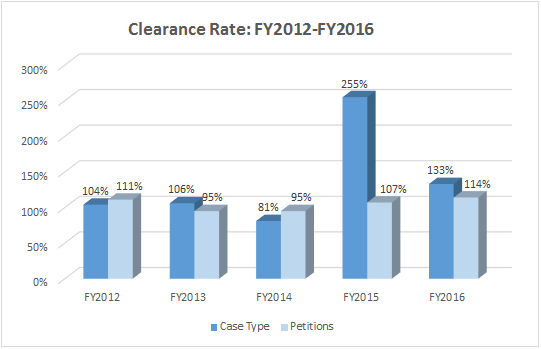 How it is measured: A clearance rate of 100% means the court has disposed of as many cases as were filed in the time period represented. A clearance rate under 100% means the court has disposed of fewer cases than were filed, resulting in an increase in cases awaiting disposition. A clearance rate over 100% means the court has disposed of more cases than were filed, resulting in a decrease in cases awaiting disposition.